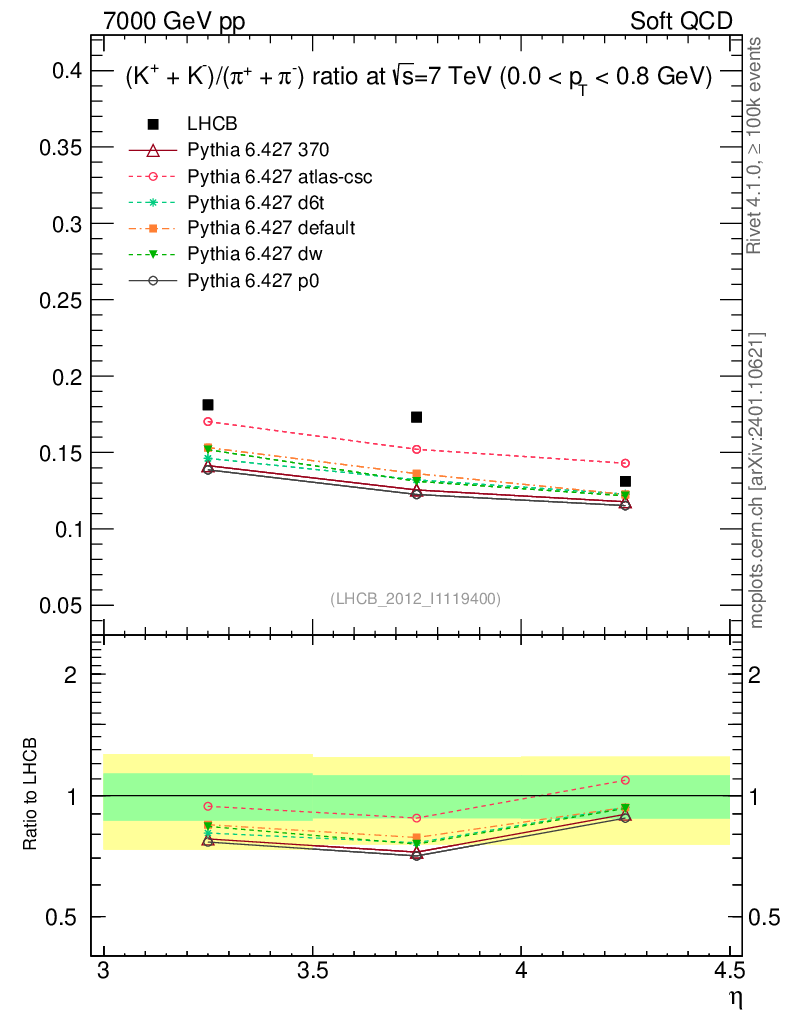 Soft QCD (inelastic) : Identified Particles : Ratios : (K-+K+)/(π-+π+) vs |y|