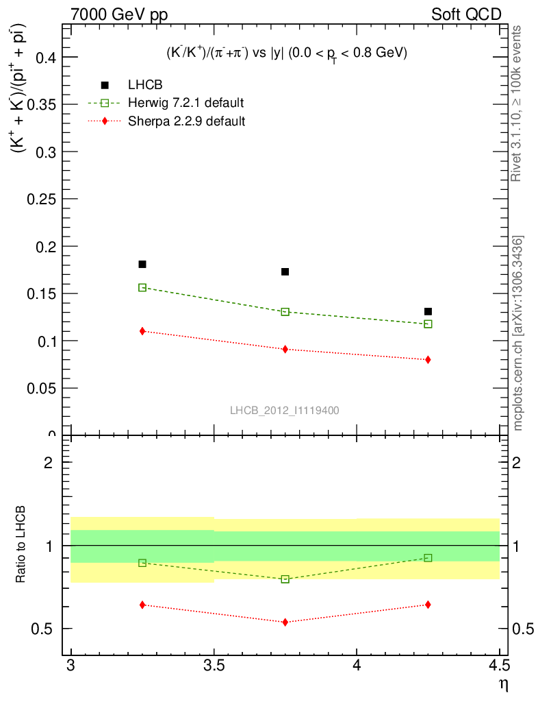 Soft QCD (inelastic) : Identified Particles : Ratios : (K-+K+)/(π-+π+) vs |y|