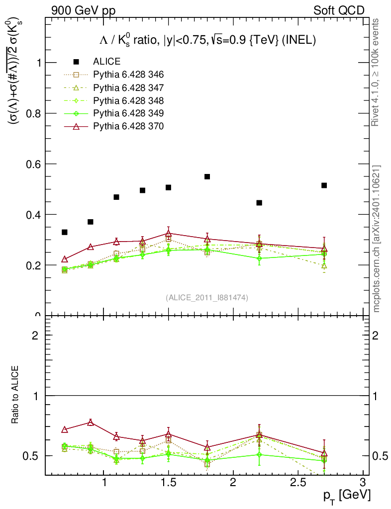 Soft QCD (inelastic) : Identified Particles : Ratios : Λ/K0S vs pT