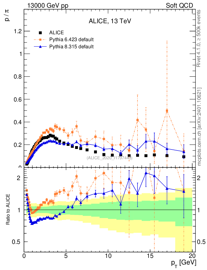 Soft QCD (inelastic) : Identified Particles : Ratios : p/π+ vs pT