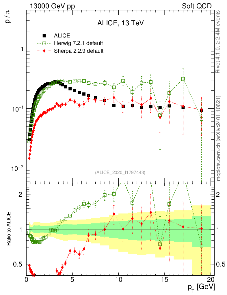 Soft QCD (inelastic) : Identified Particles : Ratios : p/π+ vs pT