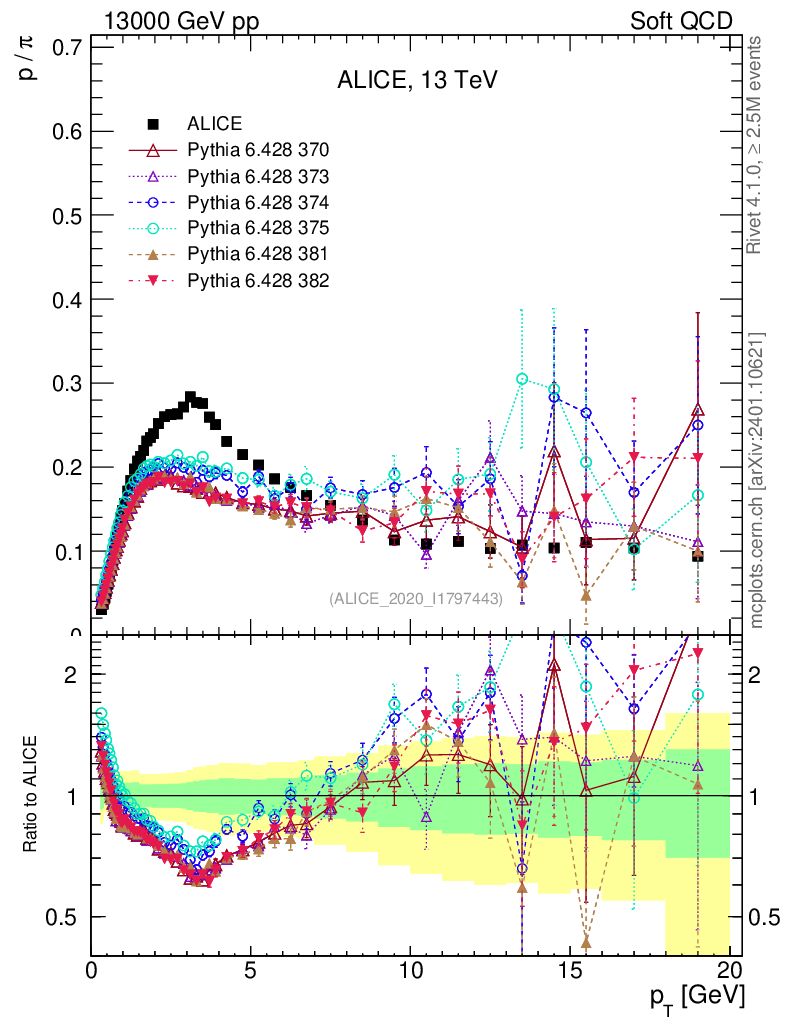Soft QCD (inelastic) : Identified Particles : Ratios : p/π+ vs pT