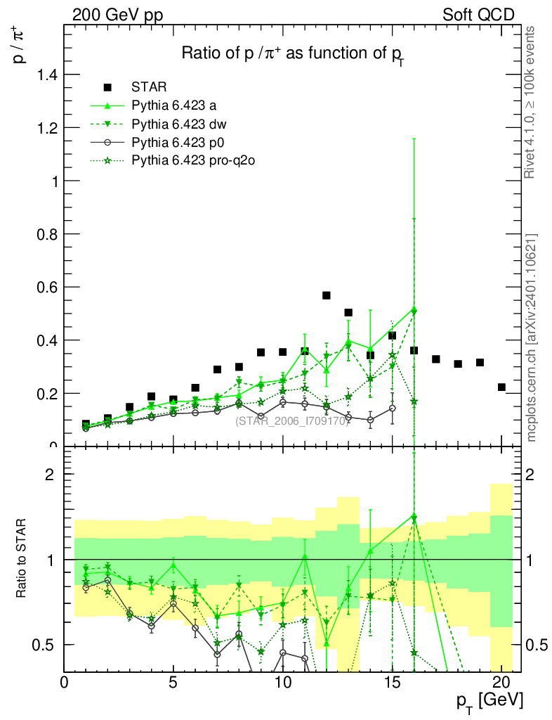 Soft QCD (inelastic) : Identified Particles : Ratios : p/π+ vs pT