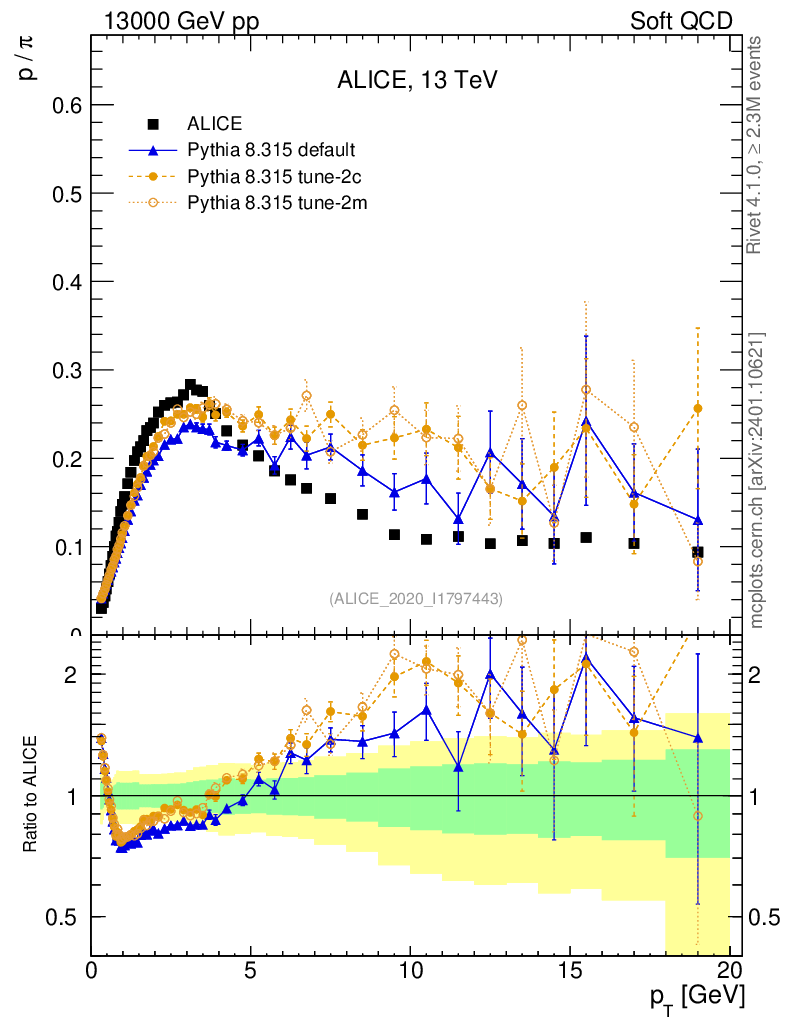 Soft QCD (inelastic) : Identified Particles : Ratios : p/π+ vs pT