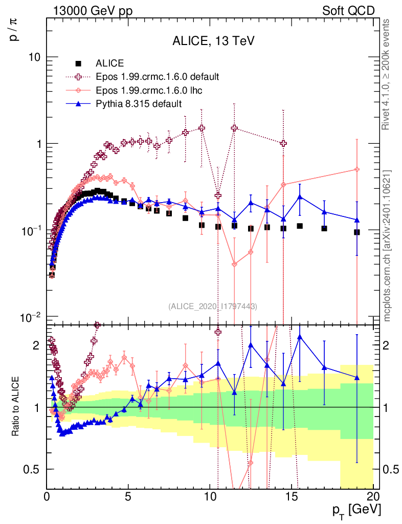 Soft QCD (inelastic) : Identified Particles : Ratios : p/π+ vs pT