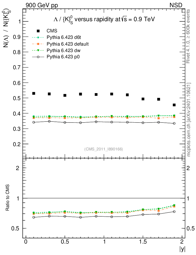 Soft QCD (nsd only) : Identified Particles : Ratios : Λ/K0S vs |y|