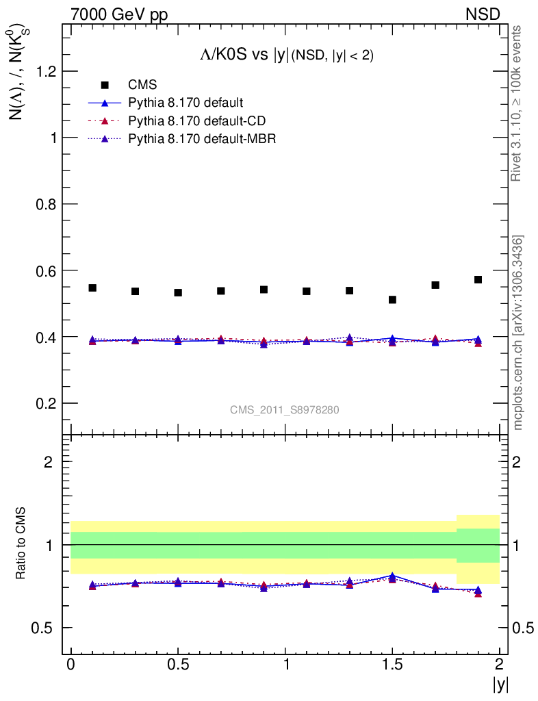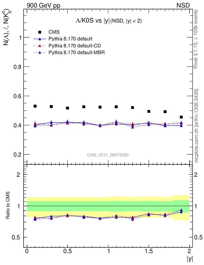 Soft QCD (nsd only) : Identified Particles : Ratios : Λ/K0S vs |y|