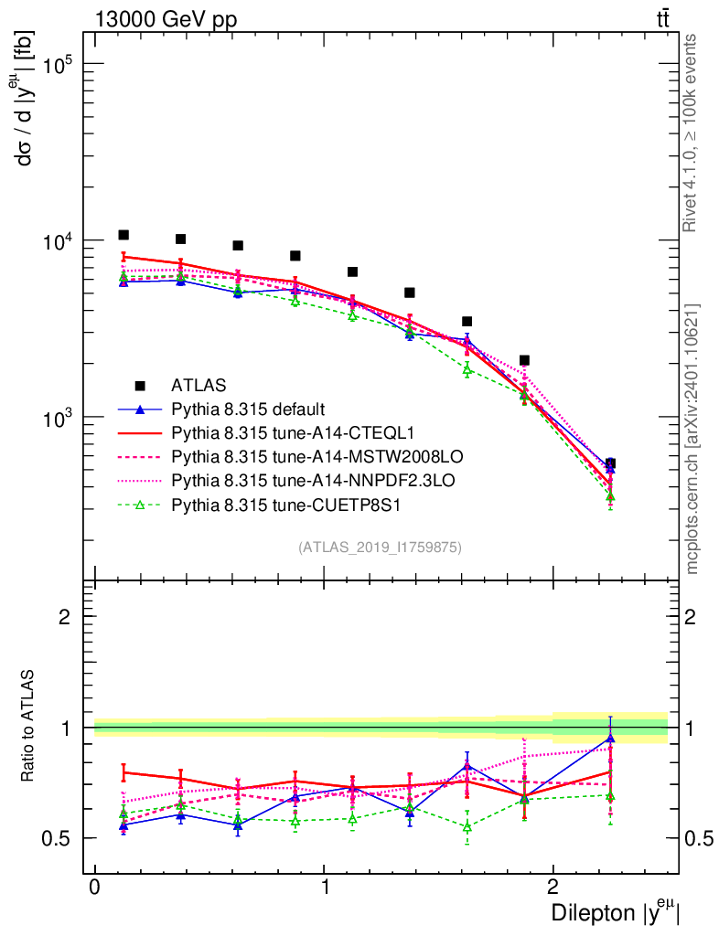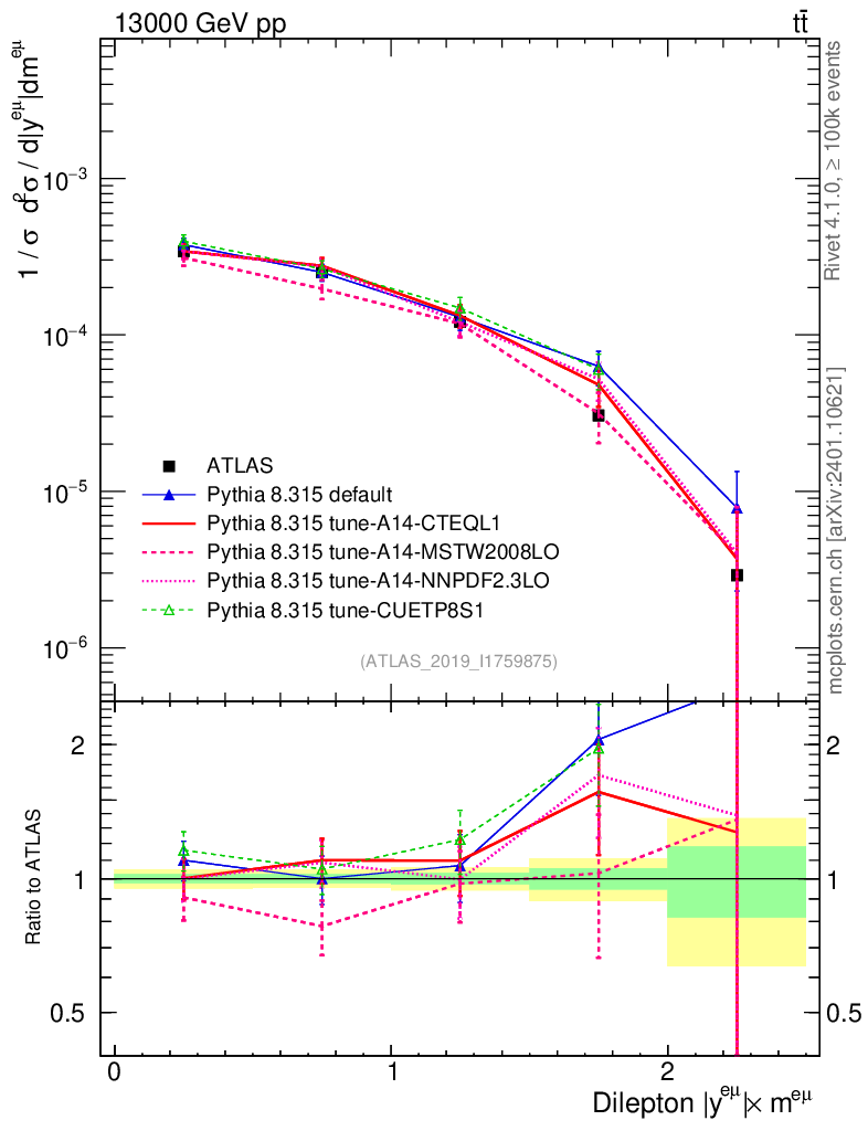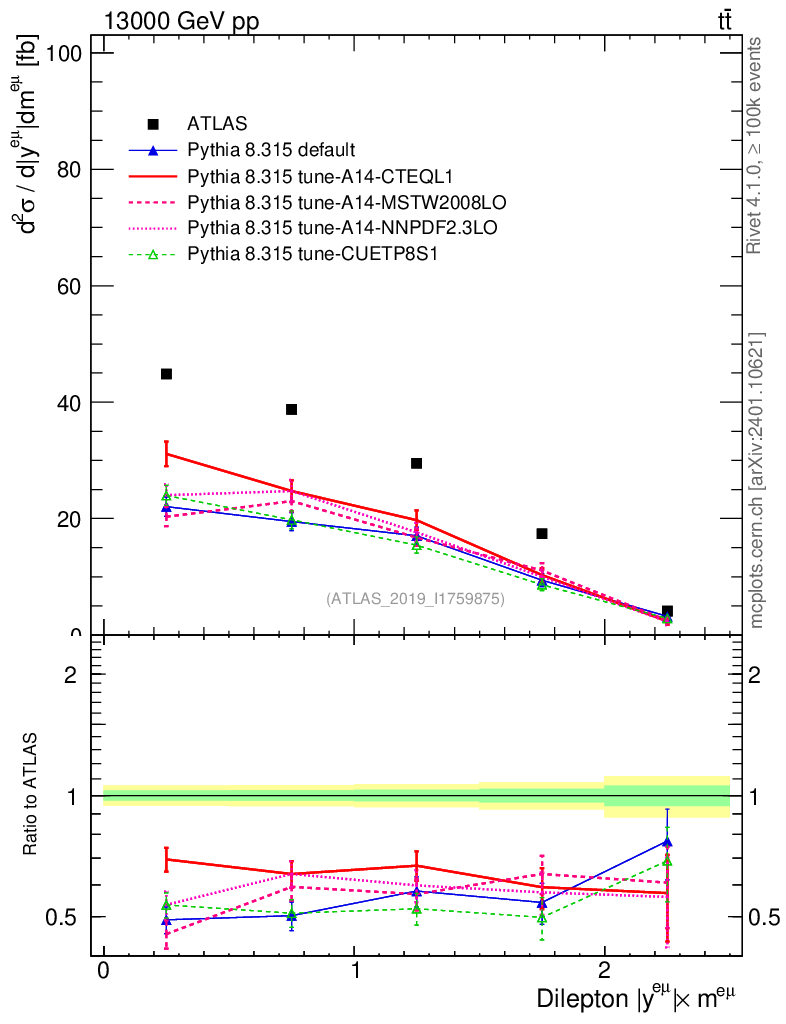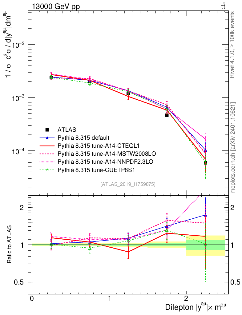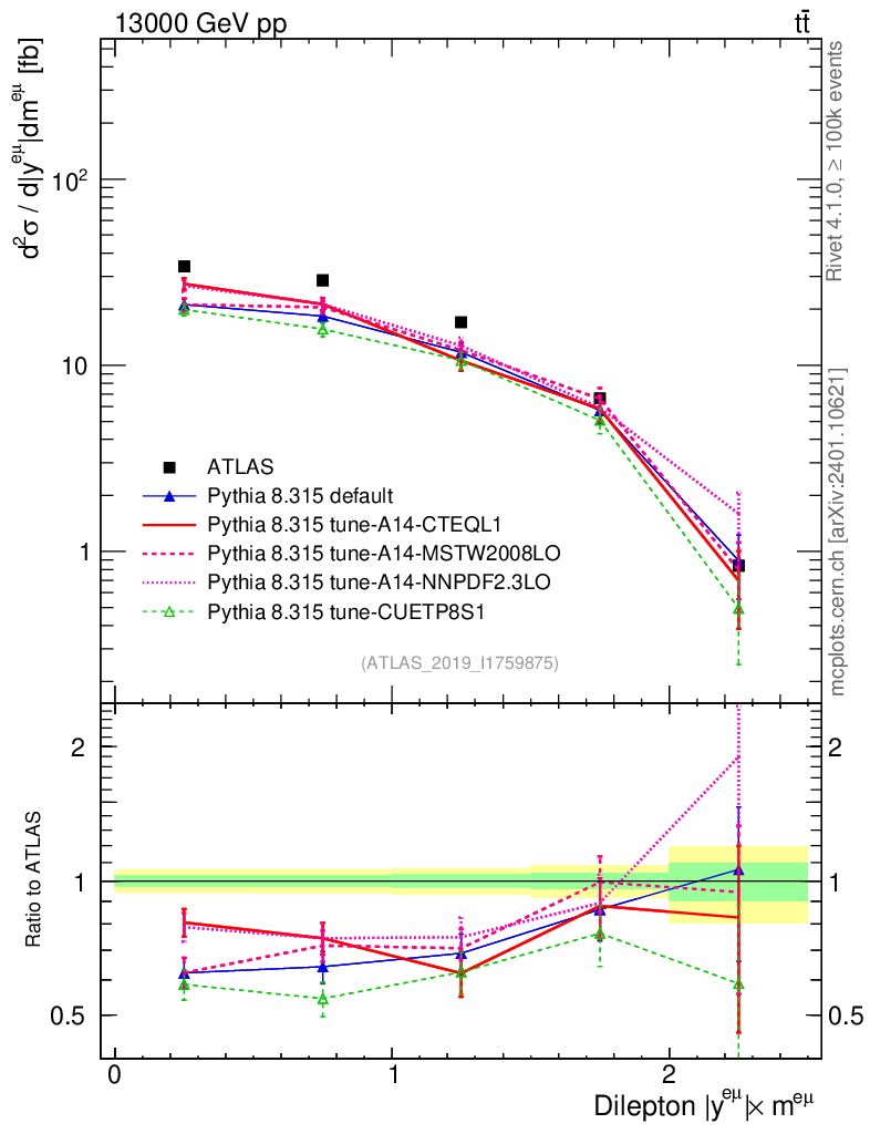 bjbj.m bjbj.pt bjt.dphi ej.pt ejej.dphi ΔR(extra jets) ejets.ht ΔR(extra, leading jet) ΔR(top, extra jet) Jet pT Lepton η Lepton pT Δφ(lepton,jet) ST(leptons, jets) nch sumpt Pouttop Top pT top.pt.ttbarRF Top rapidity topej.dphi topej.m χ(ttbar) Δφ(ttbar) Δy (ttbar) ttbar HT m(ttbar) Pcrossttbar ttbar pT ttbar.thetaStar Ttbar rapidity Mean rapidity ttbarej.ht ttbarej.m Cross sections